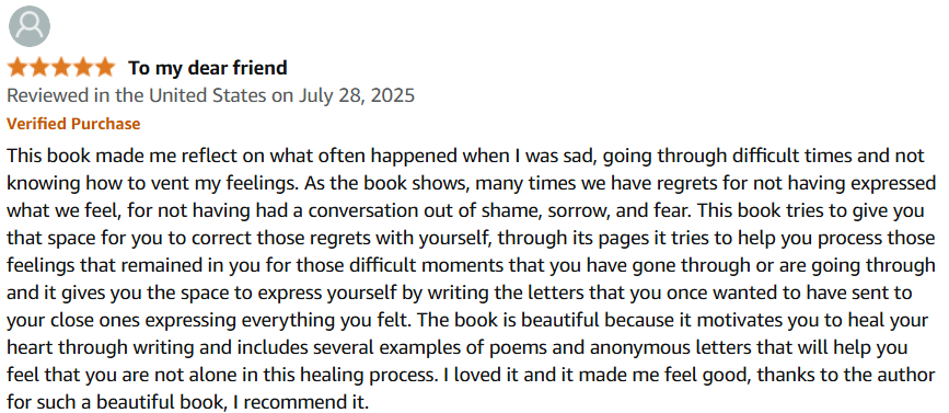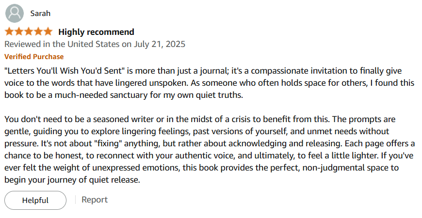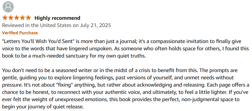 A collection of 28 poetic letters paired with prompts to help you: Release what you’ve been holding quietly. Put words to feelings you’ve never been able to say out loud. Create a gentle space for reflection and healing — without pressure to “fix” anything. This isn’t therapy. It isn’t advice. It’s a book that sits with you like a friend who gets it.